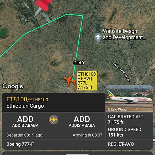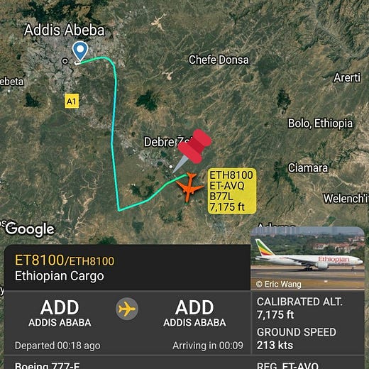 The first of the flights was only two days after Ali’s visit, on 20-21 Aug 2021, and made an intermediate stop at Addis Ababa Bole Airport. Later flights occurred on 25 Aug 2021 and on 24 Sep 2021. All of these flights were operated by Ethiopian Airlines, which was recently linked to weapons transports by CNN.